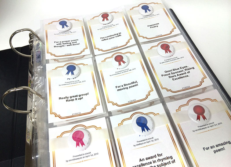 What is a Merit Badge? Merit Badges are symbols of recognition that are given at will from one member to another. Each badge is custom-designed by Writing.Com to represent a particular trait, specialty skill or theme. Send a virtual badge that is kept and displayed in the member's portfolio; mail a physical one to the member to keep and display at home! How do I give a virtual Merit Badge? There are a few ways to give someone a Merit Badge. The quickest way is to click the member's handle and choose Badges from the drop down menu, then "Send a Merit Badge" from within the member's badge page. You can also click the Shop or Gift Points link from within the left navigation under the Writing.Com logo and choose Merit Badges. You may also click here: http://www.Writing.Com/main/badges. Simply click on the Merit Badge that best suits your reason for recognition and go to the order form at the bottom of the listing. Fill out the order form and include a few comments of explanation. Make sure you have used the correct username before confirming the purchase. Each virtual Merit Badge costs 10,000 "Gift Points" After the badge is given, the member will receive a detailed notification email, the badge will be added to the Merit Badge collection within his or her portfolio "Community" tab, and, if qualified, will also added to his or her Community Recognition. Members with paid memberships are able to give one virtual Merit Badge for free every 30 days. The current status of this feature is shown at the bottom of the Merit Badge Shop. In your Gift Points log, this is handled as an entry for the normal charge for the MB followed by an entry for a credit of the MB price of the virtual MB. This discount is used when it is available, and may not be deferred for a later MB purchase. This discount may not be saved for later by not using it. Only one free MB is available at a time. The timer resets when the discount is used. To give a Merit Badge that qualifies for Community Recognition, the Merit Badge must be given at least 7 days from the time you gave that person a qualified Merit Badge before. On the confirmation screen for purchasing the Merit Badge, the system will alert you if you've sent the recipient a Merit Badge within the past 7 days. If you have, the badge(s) are shown so you can check the dates. Note: This is not a perfect solution. It is possible for the alert to be shown even though the Merit Badge would count for Community Recognition. The most recent badges are not necessarily the ones the 7 day CR requirement is based on. For example: Joe sent Sally a badge 15 days ago. Then Joe sent Sally a badge 5 days ago. The badge from 5 days ago does NOT count towards CR. Thus Joe could send Sally another badge today and it would count; however, the warning information would still be shown. Click on a Merit Badge above to see a few virtual examples. For a complete viewing of the over 500 merit badges currently in stock, please visit: http://www.Writing.Com/main/badges.php Want a custom designed Merit Badge? "Commission a Custom Merit Badge" How do I send a physical Merit Badge? When you give a virtual Merit Badge, you also have the option to gift a physical version that will be sent to the member by USPS First Class mail. The member will receive your gifted Merit Badge in the form of a 1" button pin attached to a keepsake card (see photos below). The pins can be displayed as a collection or worn individually. The cards are standard sports-card size, so that they can be kept in a collection of sleeves. Each physical Merit Badge costs 32,500 "Gift Points" FREQUENTLY ASKED QUESTIONS Virtual Merit Badges To whom should I give a Merit Badge? Merit Badges should be given to any Writing.Com member whom you would like to recognize for any reason. Is there someone you feel has excelled in a certain genre or a type of writing? Has a member supported you through his or her words or actions? Do you see someone participating in the community and want to recognize his or her efforts? No reason is too trivial; all members appreciate positive recognition for whatever reason! Merit Badges are also a great way to reward members who have excelled in a project or fulfilled their requirements in a group. They are great to use as prizes in a contest; reward the winning authors with Merit Badges and their items with "AwardIcons" Why should I give a Merit Badge? Merit Badges received by a member count toward his or her "Community Recognition" How can I view a member's Merit Badges? Clicking on a member's Community Recognition number will launch a window containing a summary of merit badges that he or she has received. Merit Badges also reside on an author's "Community Tab" Is there an easy way to tell which Merit Badges a member does not have? To view a member's Merit Badge Checklist page, left click the member's handle menu, click on Badges and at the top right of that page, click on How many Merit Badges may I give out? There is no limit on the number of Merit Badges you may give out to other members. However, only one given Merit Badge per member per 7 day period counts toward a member's Community Recognition. How many Merit Badges can I collect? There is no limit on the number of Merit Badges you can receive from other members. However, only one received Merit Badge per member per 7 day period counts toward your Community Recognition. Where will my virtual Merit Badges be stored? How can I find them? You can quickly access a complete summary of your Merit Badges by clicking the Community Recognition number located next to your handle. Using this method, Merit Badges can be viewed individually by topic or as an entire collection. All of your Merit Badges will also be stored and available from within your portfolio. To view your collection from within your portfolio, just head to your portfolio and click the "Community" tab. Visitors to your community recognition and portfolio will also access your Merit Badges from t